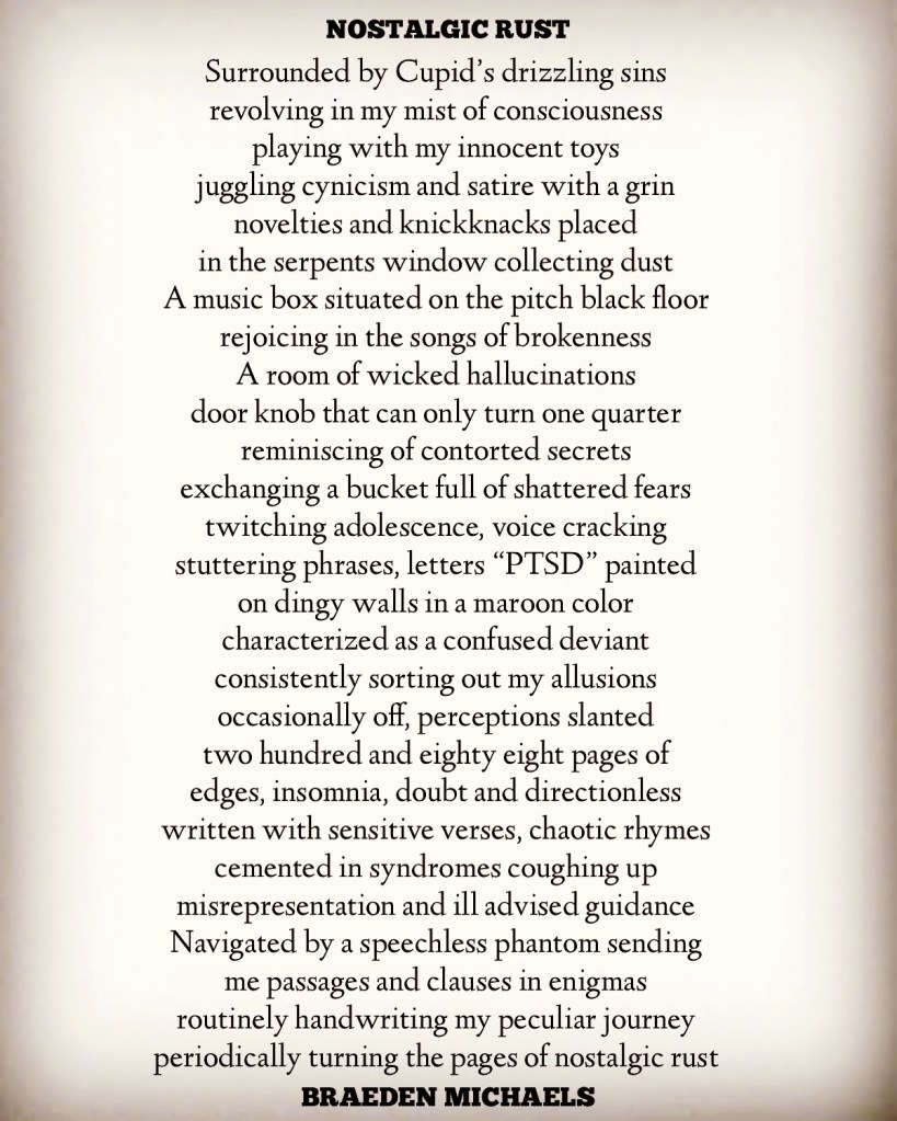 From the mind of Braeden Michaels, drink from this cup, the raven’s poison, a concoction of his collected poems all about the human condition. Imbibe in the rainbow of emotions found in the soul’s colors and taste the bitter aftertaste when you’re drenched in rage.