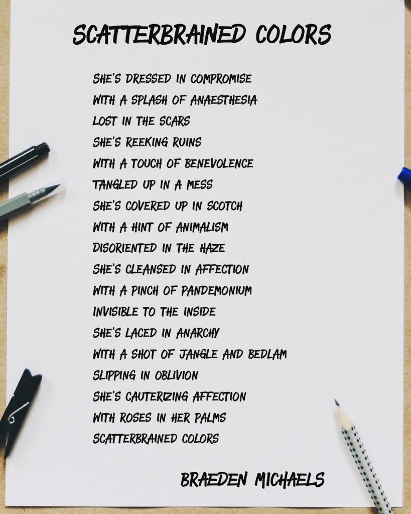 I wear my pride like a tattoo with animosity sewn to my arms. I am slightly dysfunctional and walk with a scorched tongue. I have an appetite to be understood than loved. Love is just a mirror that shatters over and over. Affection is just an object that we all hunger. I wiped away the frustration from my eyes and see myself residing in the winter’s scream. Please don’t hold me, just reach in to breathe in my cold air.