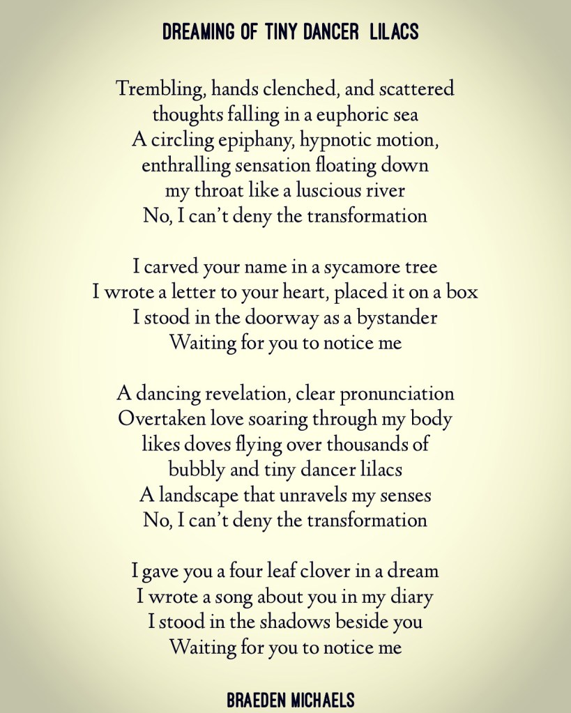 A wicked charm alluring Sweat pouring, rhythmic tongue “Magic not seeing what was tragic” Insatiable endless night dancing Clawing and reaching for tenderness